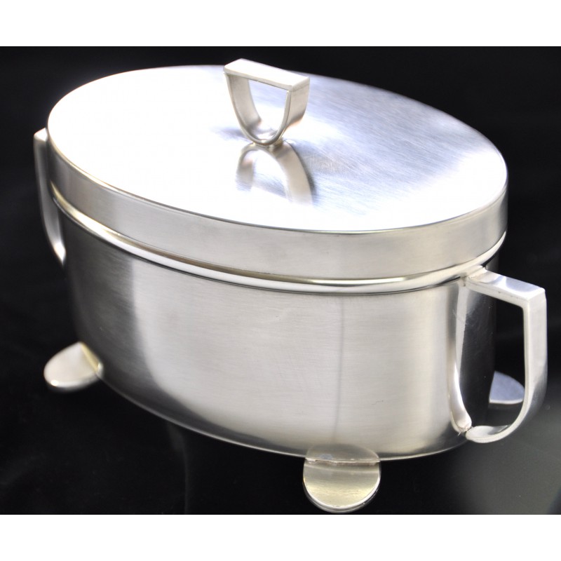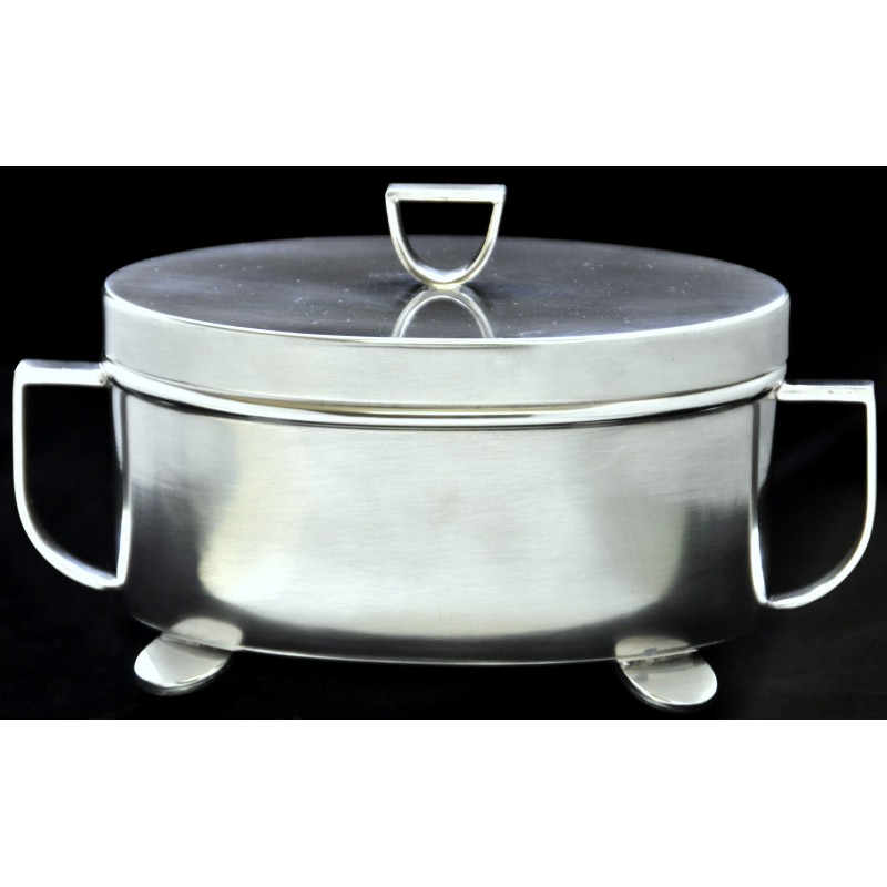 Cukiernica w modnym stylu art deco pasującym zarówno do klasycznych jak i nowoczesnych wnętrz. Wyrób wykonany ręcznie, posrebrzany, posiada firmową sygnaturę A.Stępkowski- oryginał. Wymiary : 13 cm x 7 cm, około 7 cm wysokości. Dobry pomysł na stylowy prezent, np. ślubny, świąteczny, który można uzupełnić grawerowaną pamiątkową dedykacją.
