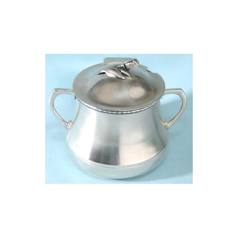 Śliczna cukiernica o prostej stylistyce . Wieczko ozdobione leżącym tulipanem. Cukiernica wykonana jest ręcznie i platerowana jest srebrem.Wymiary : średnica 10 cm x13 cm wyskości.