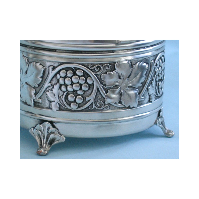 Śliczna cukierniczka z motywem winogronowym, wykonana ręcznie, platerowana srebrem, posiada firmową sygnaturę A. Stępkowski. Wymiary: średnica ok 10 cm, około 11 cm wysokości.