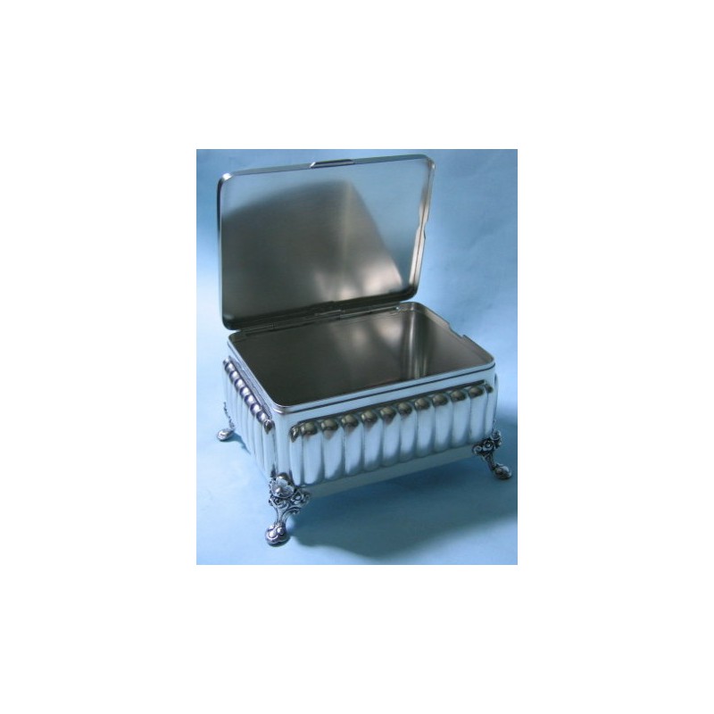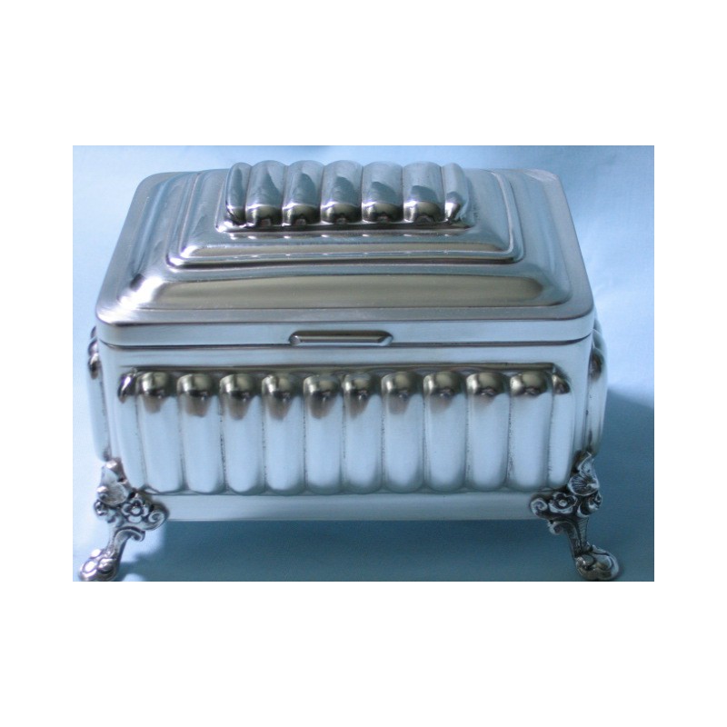 Klasyczna, ręcznie wykonana cukiernica platerowana srebrem - elegancka stylistyka. Wyrób posiada firmową sygnaturę A. Stępkowski, wymiary: 15 cm x 11 cm x 8 cm.