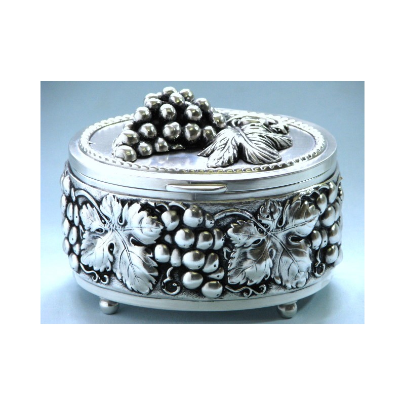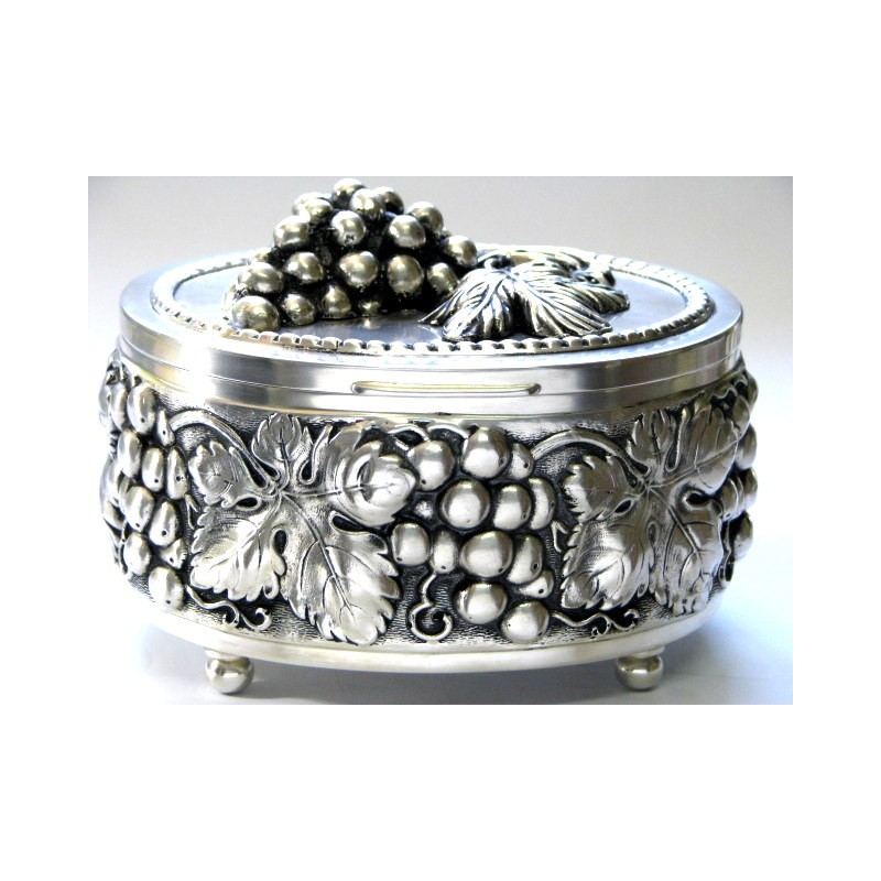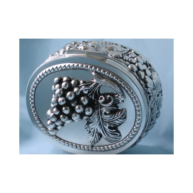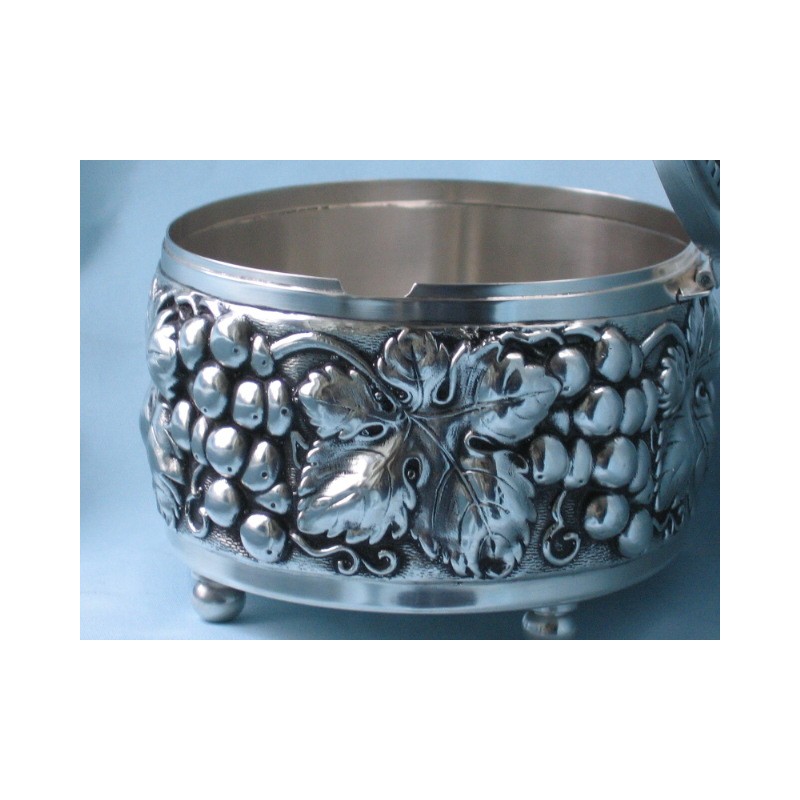 Piękna, platerowana srebrem , masywna i okazała cukiernica zdobiona pięknym, plastycznym motywem winogronowym. Wyjątkowo ciekawa forma wieka, na którym "leży" kiść winogrona (możemy ją wykonać w dwóch wersjach - błyszczącej lub matowej wg gustu Klienta). Wyrób wykonany jest ręcznie, posiada firmową sygnaturę. Wymiary: 15 cm x 12 cm x 10 cm.