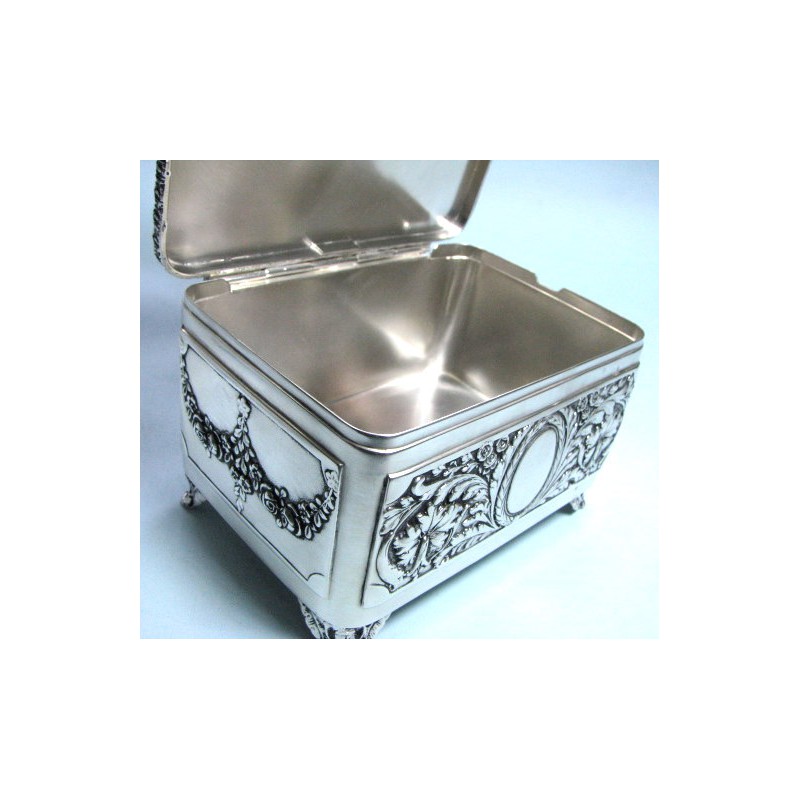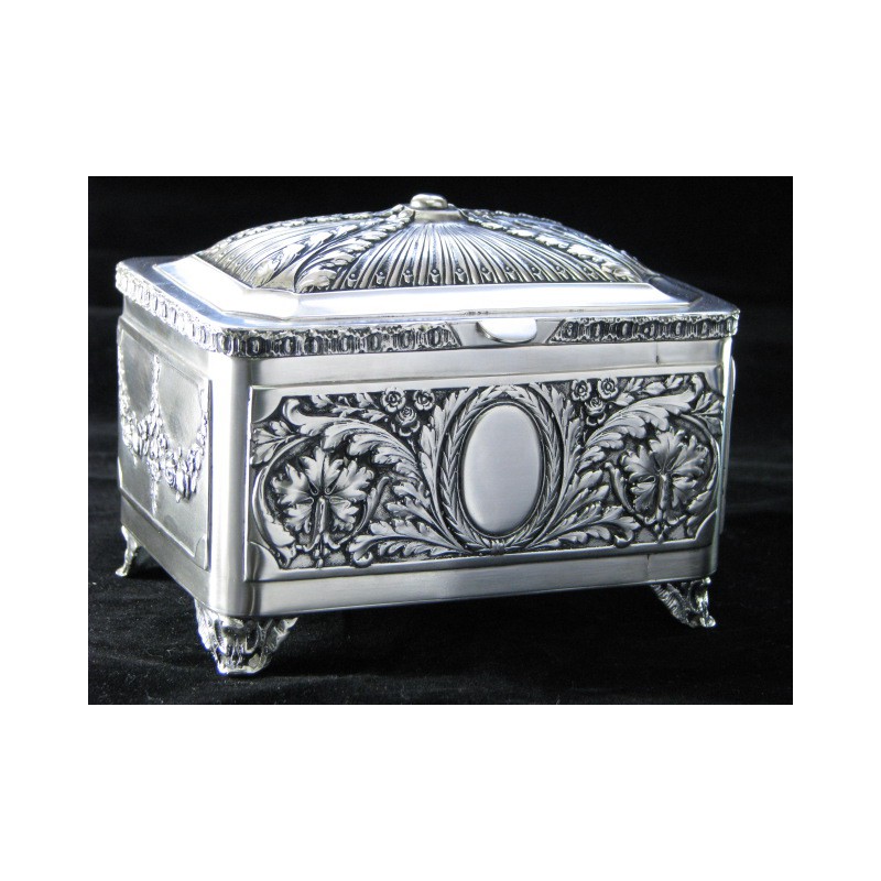 Elegancka, klasyczna, ręcznie wykonana cukiernica platerowana srebrem - piękna ornamentyka roślinna. Wyrób posiada firmową sygnaturę A.Stępkowski, wymiary : 14 cm x 9 cm x 10 cm. Może się stać oryginalnym prezentem np. ślubnym, jest na niej miejsce do wygrawerowania monogramu rodzinnego lub okazjonalnej dedykacji.