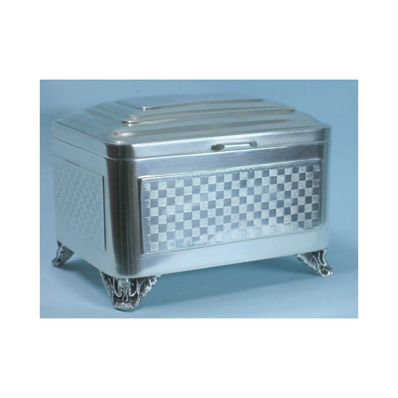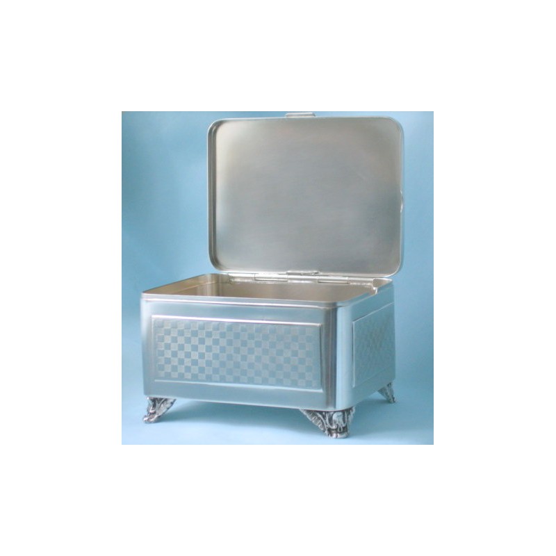 Elegancka, cukiernica skrzynkowa, platerowana srebrem, ozdobiona motywem szachownicy. Wyrób posiada firmową sygnaturę A.Stępkowski. Wymiary : 12cm x 10 cm x 9 cm. W ofercie posiadamy również tacę zdobiona tym samym rysunkiem.