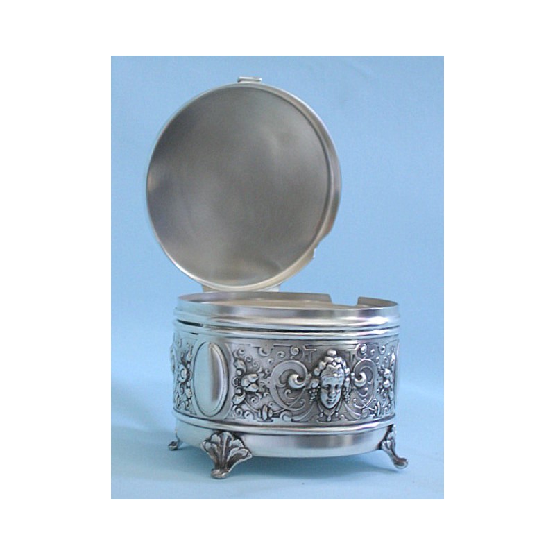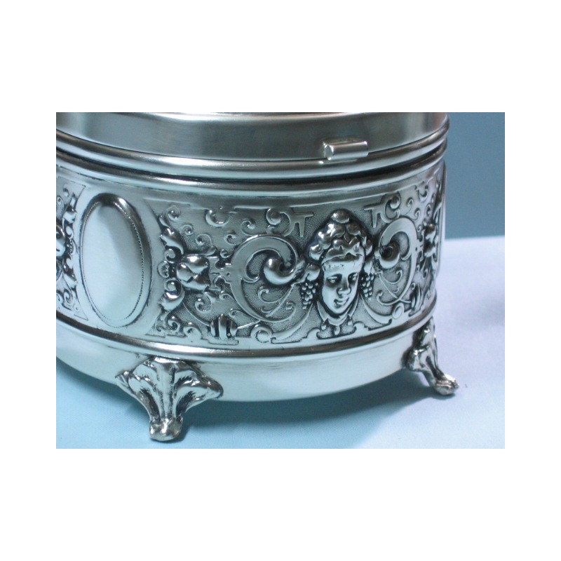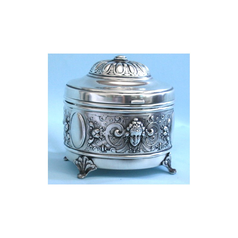 Urocza, zdobiona motywem secesyjnych główek, bardzo zgrabna, wykonana ręcznie , platerowana srebrem cukiernica. Wyrób posiada firmową sygnaturę . Wymiary : średnica 10 cm, około 11 cm wysokości. W ofercie mamy również żardinierę z tym samym motywem.