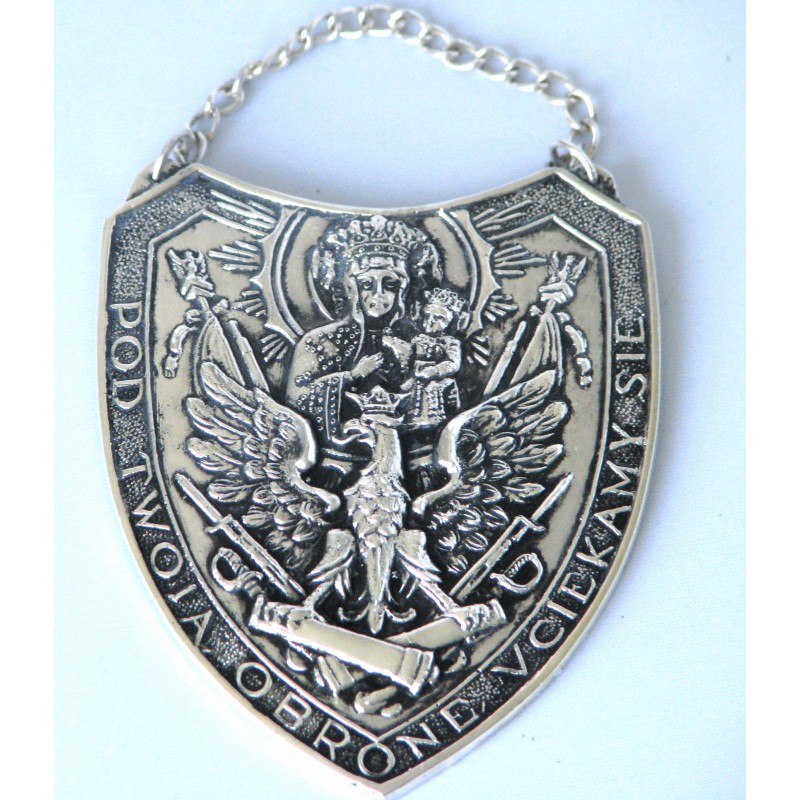 Ręcznie wykonany , platerowany srebrem mały ryngraf z Matką Boską Częstochowską, orłem w koronie oraz symbolami walki Polaków - posiada firmową sygnaturę A. Stępkowski . Wymiary :7 cm x 8 cm. Ryngraf wieszany jest na łańcuszku, dodatkowo z tyłu jest mały wieszaczek .