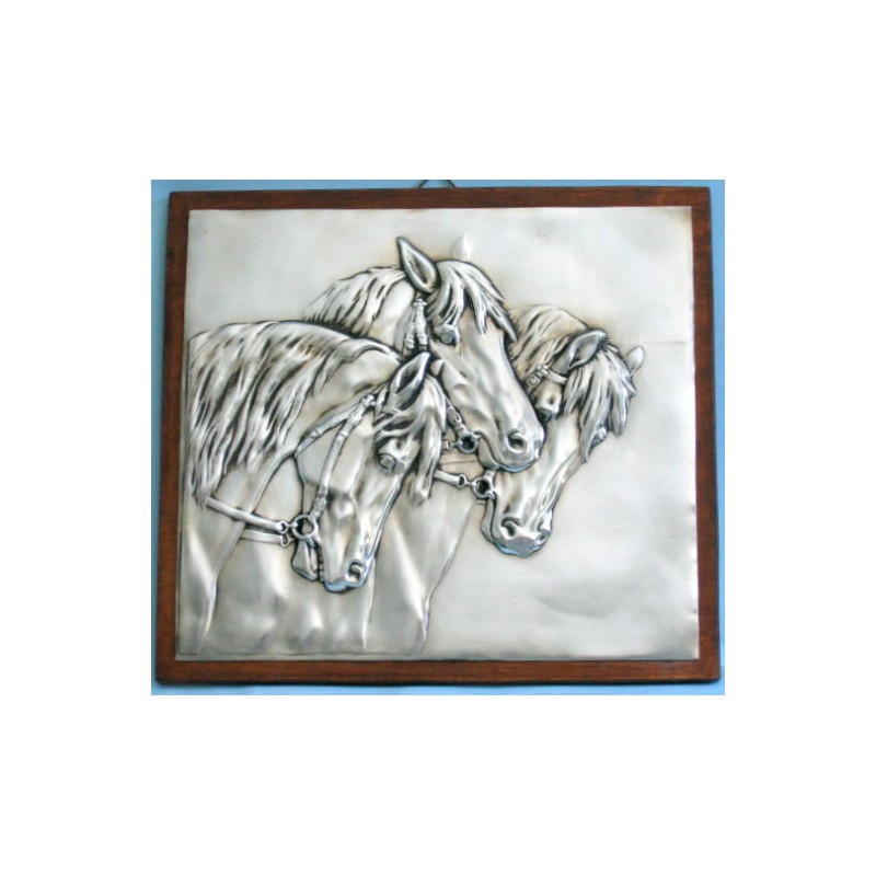 Śliczna płaskorzeźba przedstawiająca półplastyczny rusunek trzech koni. Wyrób jest platerowany srebrem , od spodu deska z wieszaczkiem i firmową sygnaturą.Wymiary 31 cm x 28 cm . Doskonały pomysł dla "koniary, koniarza" , ale nie tylko.