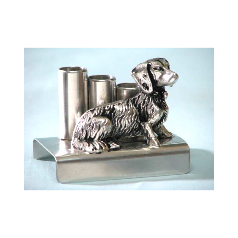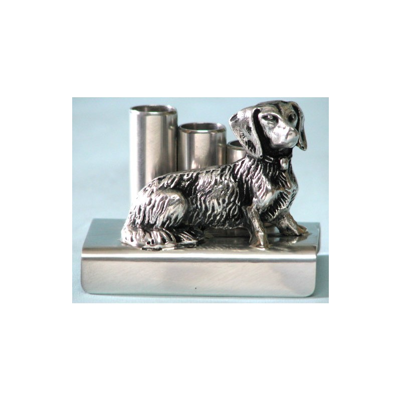 Oryginalna podstawka na długopisy z jamnikiem długowłosym Całość wykonana ręcznie , posiada firmową sygnaturę A. Stępkowski. Idealnie zaprezentuje się na eleganckim biurku -dobry pomysł na prezent firmowy. Ciekawym uzupłenieniem może być indywidualny grawerunek. Wymiary 7 cm x 4,5 cm x 6 cm