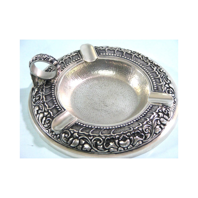 Bardzo elegancka popielnica z oryginalnym ozdobnym uchwytem- delikatna ornamentyka roślinna. Wyrób wykonany jest ręcznie, platerowany srebrem, posiada firmową sygnaturę A.Stępkowski.