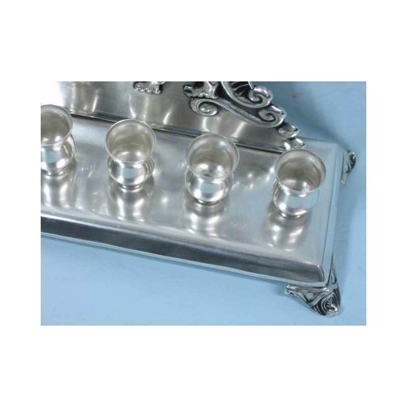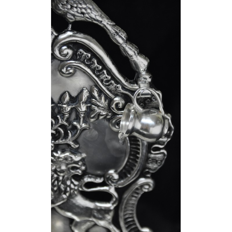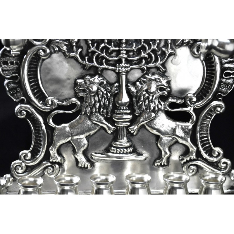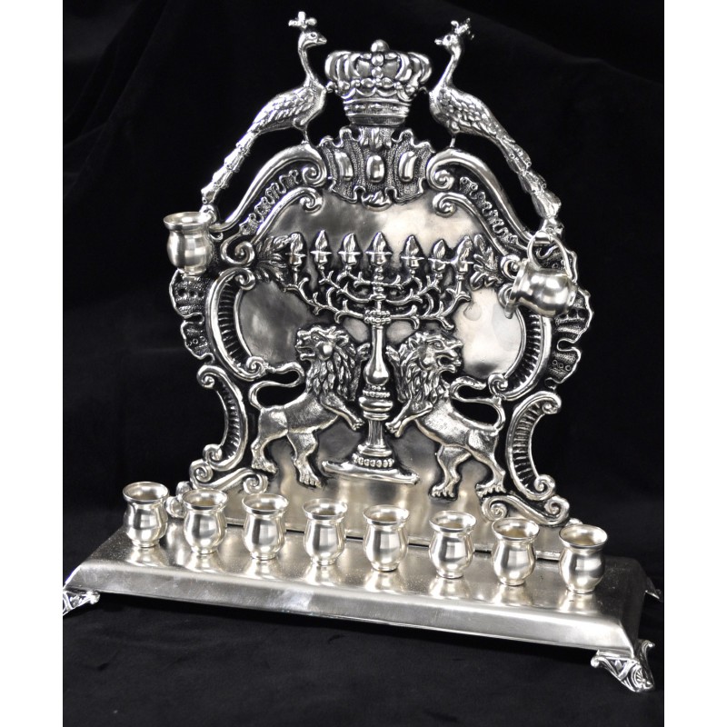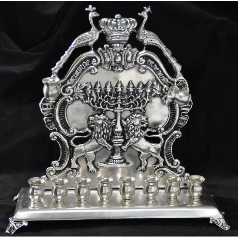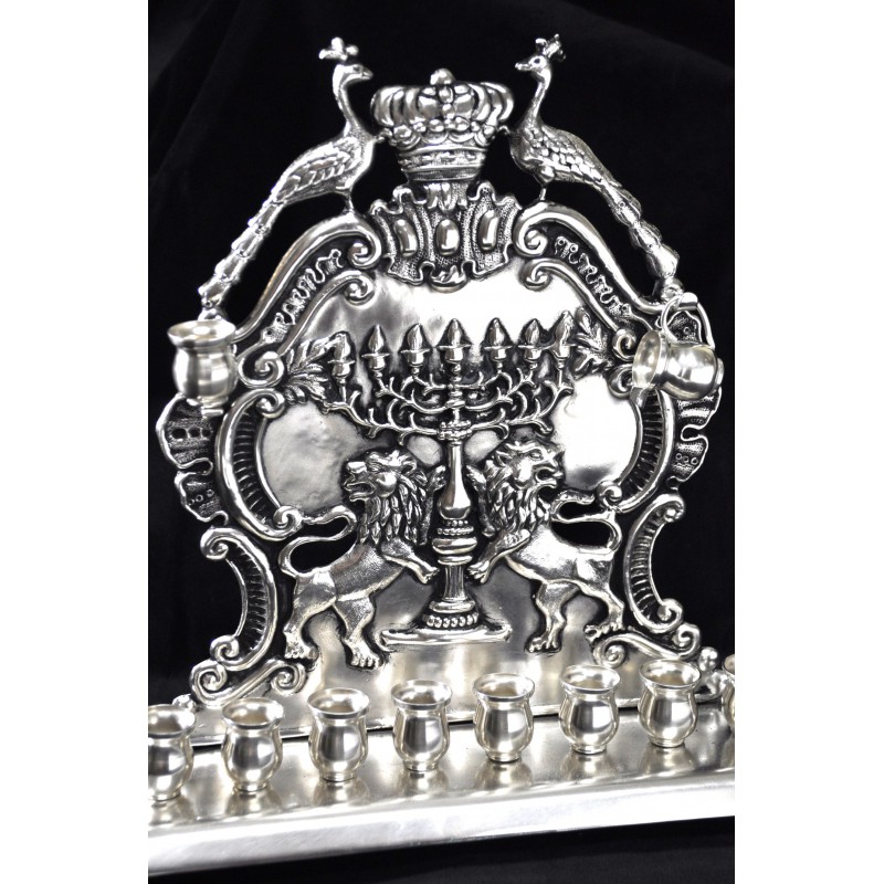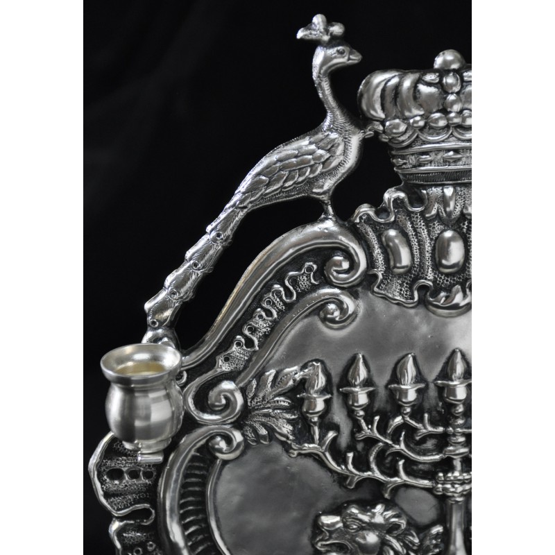Ręcznie, misternie wykonany, platerowany srebrem świecznik - lampa chanukowa. Na poziomej podstawie lampy - 8 kieliszków na świece, ekran w formie rocaille'owego kartusza z motywem lwów podtrzymujących menorę, zwieńczony parą pawi i koroną. Po bokach ekranu umieszczone szames i dzbanuszek na oliwę. Wyrób ma wymiary około 27 cm x 9 cm i 27 cm wysokości, posiada firmową sygnaturę