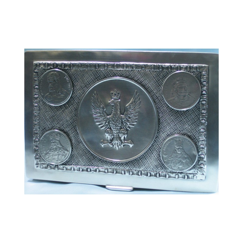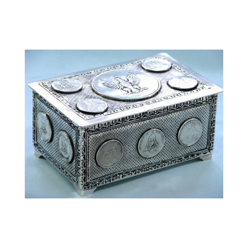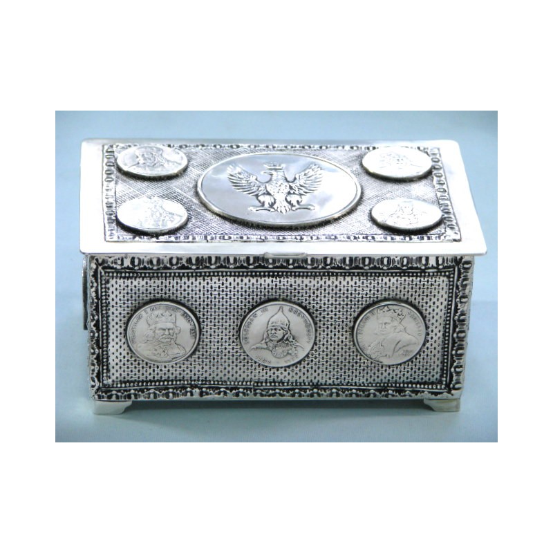 Ręcznie wykonana ( polskie rzemiosło!!! ) szkatułka platerowana srebrem zdobiona wizerunkami z serii Królowie Polski . Szkatułka na biżuterię lub inne precjoza - doskonałe uzupełnienie kolekcji nunizmatycznej . Posiada firmową sygnaturę A.Stępkowski, wyłożona jest aksamitem. Wymiary szkatułki 16m x 11 cm x 8 cm.