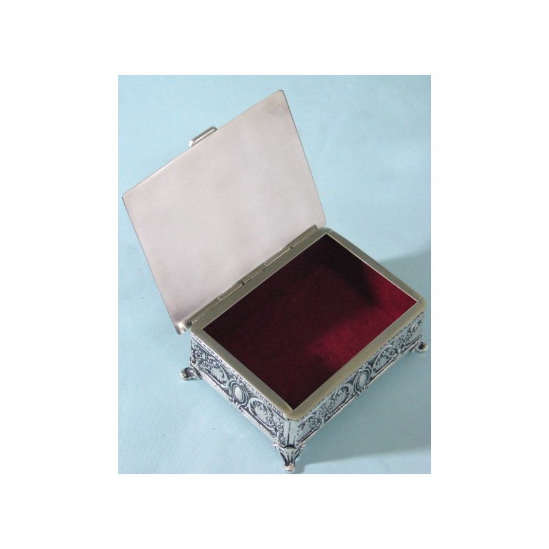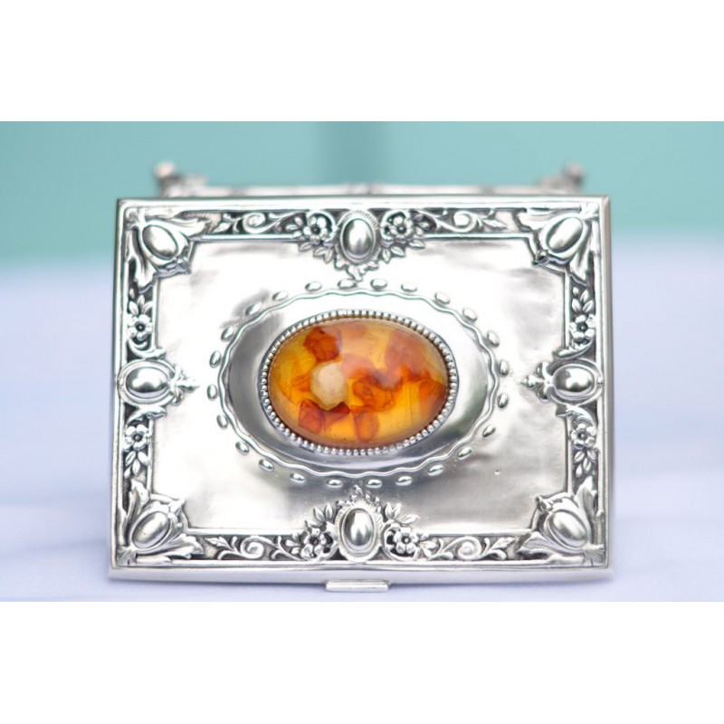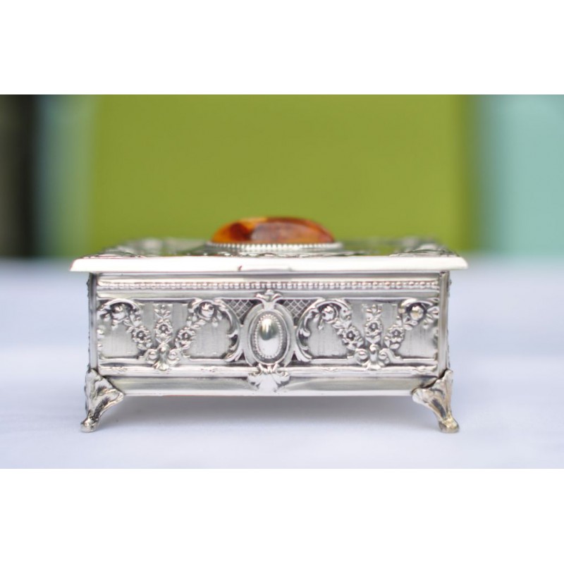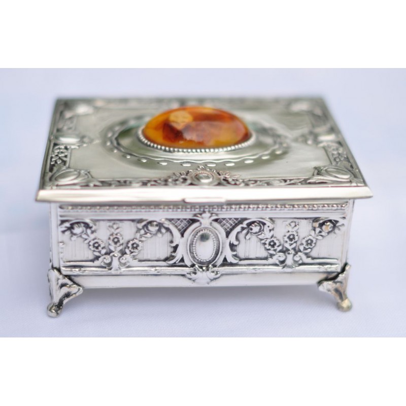 Ręcznie wykonana ( polskie rzemiosło!!! -wzorowana na starym wyrobie) szkatułka posrebrzana z bursztynem na biżuterię lub inne precjoza - doskonała na upominek dla każdej kobiety. Bursztyn na wieczku szkatułki - naturalny bursztyn prasowany . Posiada firmową sygnaturę , wyłożona jest materiałem, wymiary:12 cm x 10 cm x 5 cm.