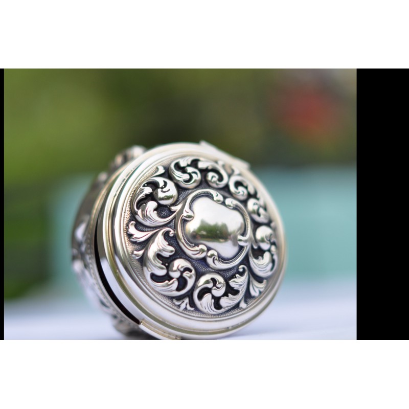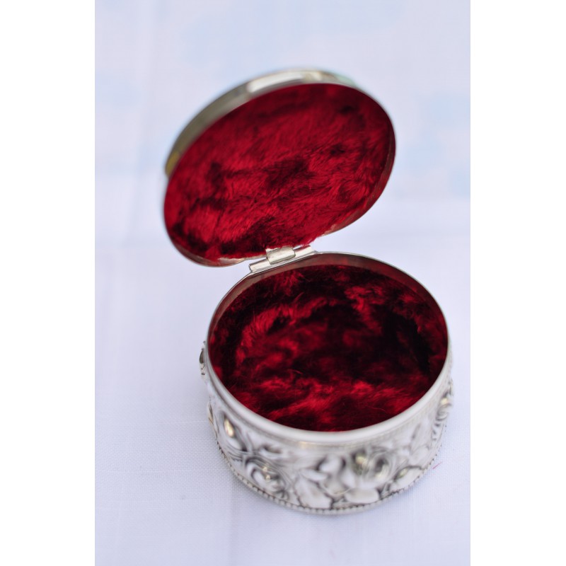 Ręcznie wykonana ( polskie rzemiosło!!! -wzorowana na starym wyrobie) szkatułka platerowana srebrem na biżuterię lub inne precjoza - doskonała na upominek dla każdej kobiety. Wymiary: średnica 8 cm x 6 cm wysokości