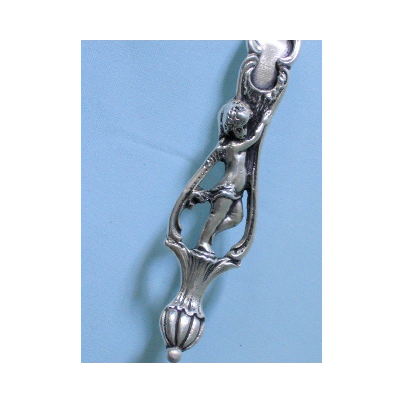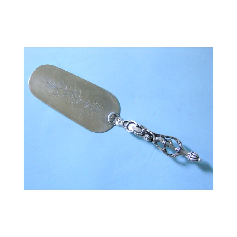 Piękna, masywna łopatka do ciasta/tortu - ręcznie wykonana, platerowana srebrem - ozdobę stanowi rączka z półplastycznym rysunkiem amorka. Doskonale sprawdzi się jako dodatek do eleganckiego stołu, zwłaszcza z dostępną również w naszym sklepie tortownicą.
