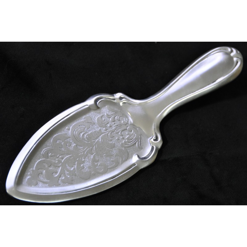 Śliczna i bardzo wygodna w użytkowaniu łopatka do ciasta i tortu. Zdobiona jest delikatną oranmentyką roślinną. Wyrób posiada firmową sygnaturę i jest posrebrzany.