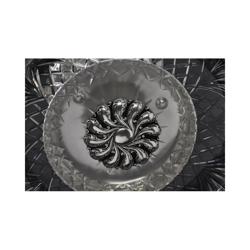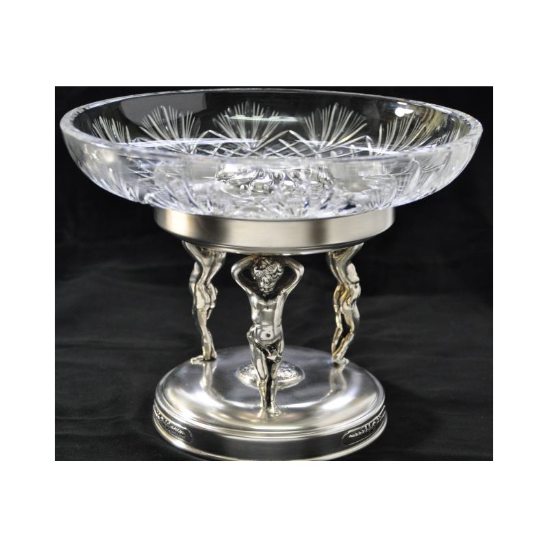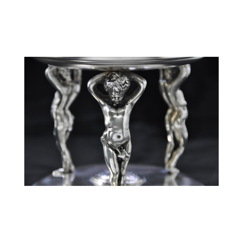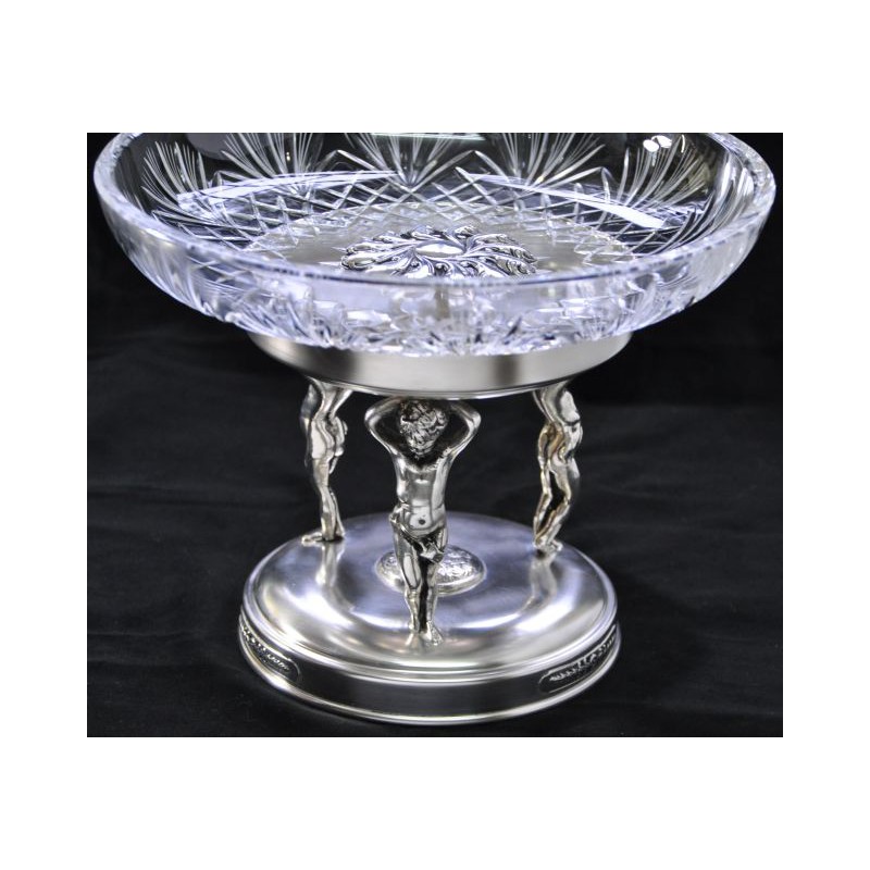 Elegancka, bardzo ozdobna, ręcznie wykonana, patera platerowana srebrem o niezwykle pięknej podstawie - trzy plastyczne amory podtrzymujące na dłoniach piękny kryształowy talerz (szlif kryształu może się różnić od tego widocznego na zdjęciu). Patera posiada firmową sygnaturę. Pięknie prezentują się na niej słodycze i owoce. Wymiary: ok. 17 cm wysokości x 22 cm średnicy talerza.