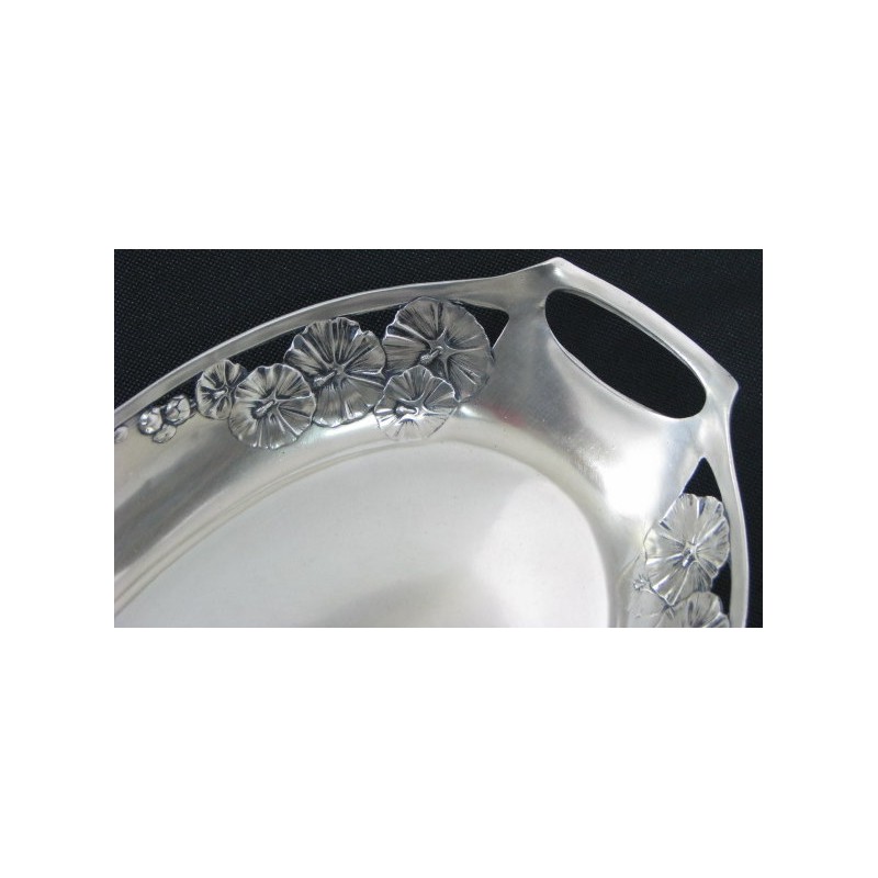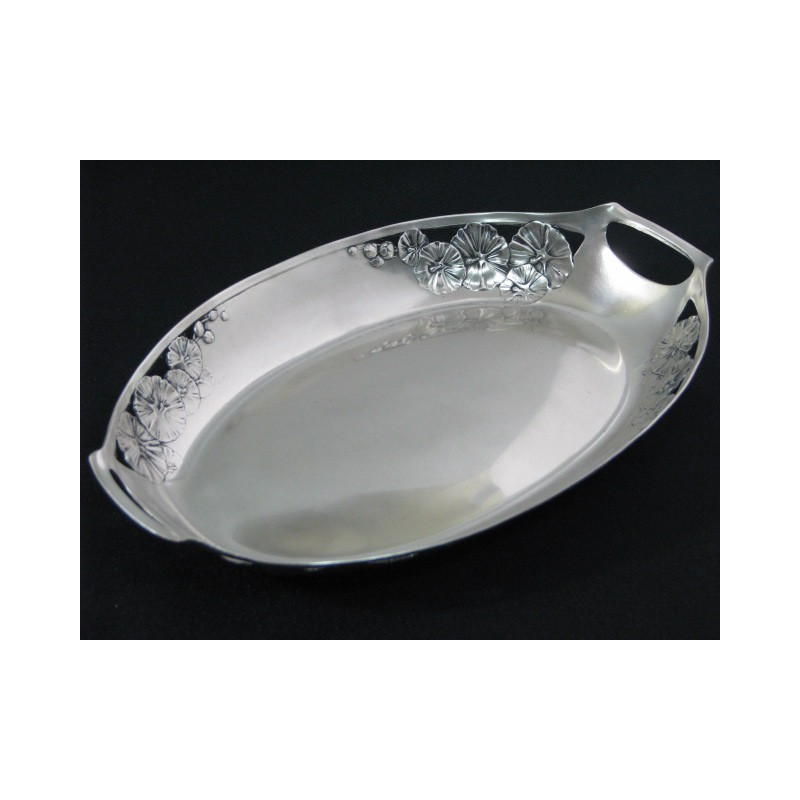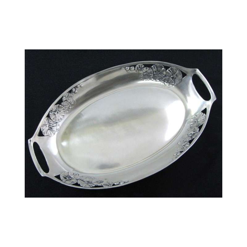 Elegancki srebrzony chlebak/paterka. Bardzo delikatna stylistyka, zdobiona motywami roslinnymi sprawi, iż dobrze zaprezentuje się na każdym stole. Wymiary 31 cm x 19 cm, firmowa sygnatura A. Stępkowski Plater .