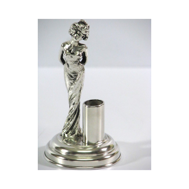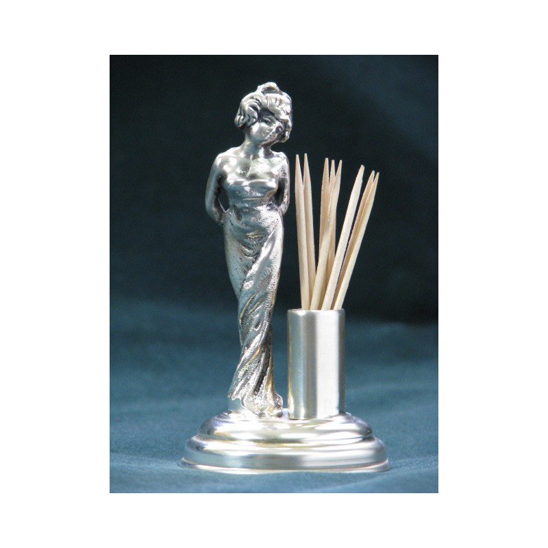 Niezwykle ozdobny i oryginalny przedmiot - pojemnik na wykałaczki lub długopis platerowany srebrem z bardzo wdzięcznym motywem -secesyjną figurką kobiety w sukni . Przedmiot posiada firmową sygnaturę A. Stępkowski Wymiary podstawki: całkowita wysokość ok. 8 cm, średnica podstawy około 5 cm (wysokość samego pojemnika na wykalaczki 2,5 cm, średnica ok 1 cm). Śliczny, oryginalny upominek dla Mamy , Żony, Szefowej.